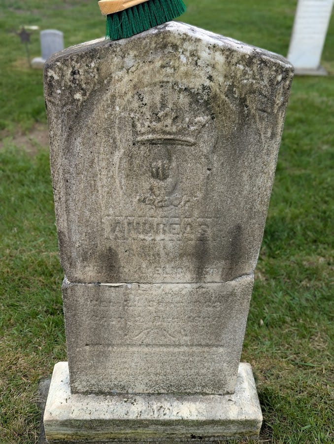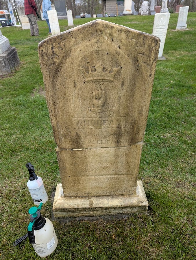 After meeting Ron while strolling in a local cemetery, I was invited to a grave yard clean up. Of course, I took up the offer. On that sunny day in late April, I was shown how to clean a headstone. It was remarkly easy to do, just spray with a certain chemical, scrub softly, and rinse. I was drawn to the crown on this headstone, so I cleaned it. The actual cleaning was meditative and surprisingly fun.